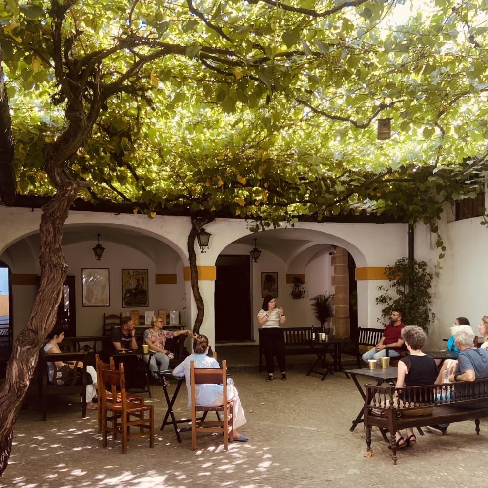 Para cerrar la jornada, dimos un paseo juntos por el centro de Jerez caminando hasta Bodegas Tradición, donde el silencio fresco de las naves, el arte escondido en sus muros y el rumor de las parras crearon un marco perfecto para seguir pensando en lo que ofrece un paisaje cuando se lo escucha.
